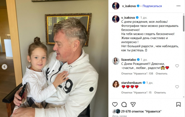 «С днём рождения, моя любовь! Фотографии твои можно разглядывать бесконечно! На тебя можно глядеть бесконечно! Живи каждый день счастливо и интересно! Нет большей радости, чем наблюдать, как ты растешь», — обратилась Виктория Исакова к Варваре в особенный день.