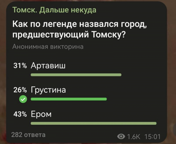 Было предложено три варианта ответа: Артавиш, Грустина, Ером. В викторине приняли участие 282 человека, а саму публикацию просмотрели более 1600 человек. 43% – подавляющее большинство – не угадали верный ответ. Более того, правильный ответ был выбран наименьшим количеством участников.