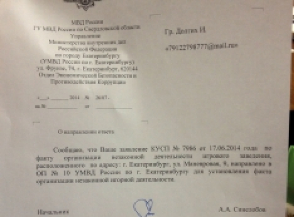 Одну из таких позорных отписок в редакцию портала «Компромат-Урал» прислал читатель, жаловавшийся на казино на Маневровой, 9. Отписка пришла от начальника отдела экономической безопасности и противодействия коррупции УМВД Екатеринбурга Андрея Синелобова: «Сообщаю, что Ваше заявление КУСП № 7986 от 17 июня 2014 года по факту организации незаконной деятельности игрового заведения, расположенного по адресу: г. Екатеринбург, ул. Маневровая, 9, направлено в ОП № 10 УМВД России по г. Екатеринбургу для установления факта организации незаконной игорной деятельности». На этом все.