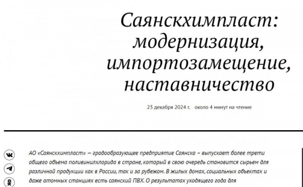 В 2023-м Саянску перепало (как раз с тех самых дивидендов) 379 миллионов рублей. Что это в масштабах города? И этой сумме так радовался покойный ныне Олег Боровский. Потому что до того таких сумм не было никогда, это случился рекорд... Именно поэтому, видимо, в хвалебном тексте нет ни слова про налоговый выхлоп предприятия и его вклад в социальное развитие города. Не о чём говорить-то!