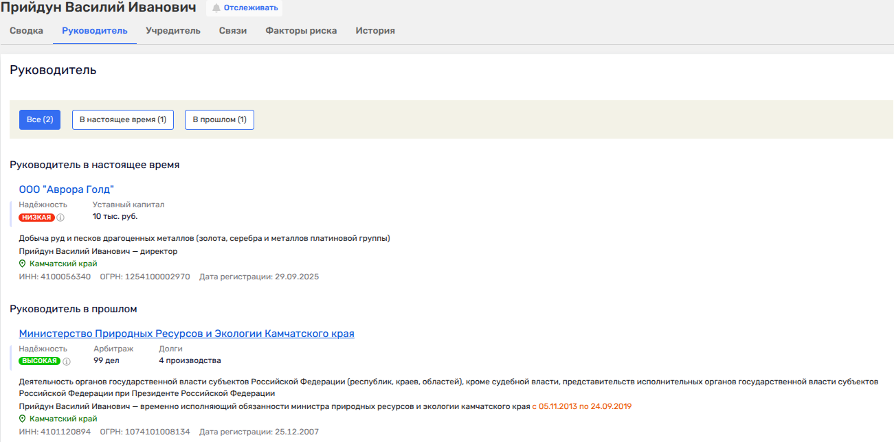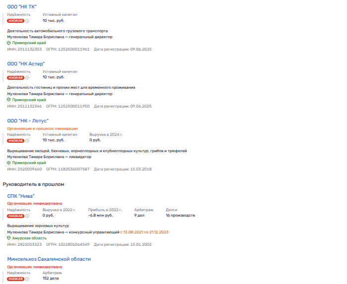 Так, в июне 2025 года в его приморской бизнес-корзинке появились ООО «НК ТК» (деятельность автомобильного грузового транспорта) и ООО «НК Астер» (деятельность гостиниц и прочих мест для временного проживания). Директором там старый проверенный экс-чиновник Тамара Муленкова, что некогда возглавляла сахалинский Минсельхоз.
