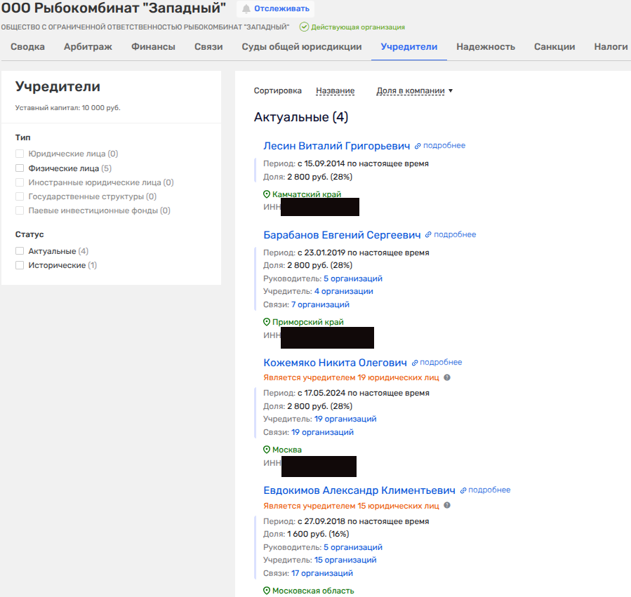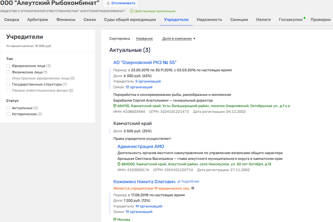 Прописано ООО вместе с активами семейства Кожемяко - дочерними компаниями бывшего госактива АО «Озерновский РКЗ № 55», которое входит в группу Salmonica, и одновременно выступает поставщиком по госконтрактам на 64 млн рублей.