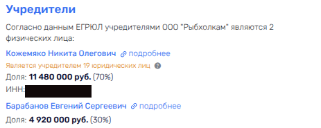 Видимо, за прикрытие в бизнесе Евгений Барабанов и получил 28% в ООО «Рыбокомбинат Западный», которое входит в ГК Salmonica. Там же в числе владельцев мы видим Никиту Кожемяко и давнюю ширму семьи губернатора Александра Евдокимова.