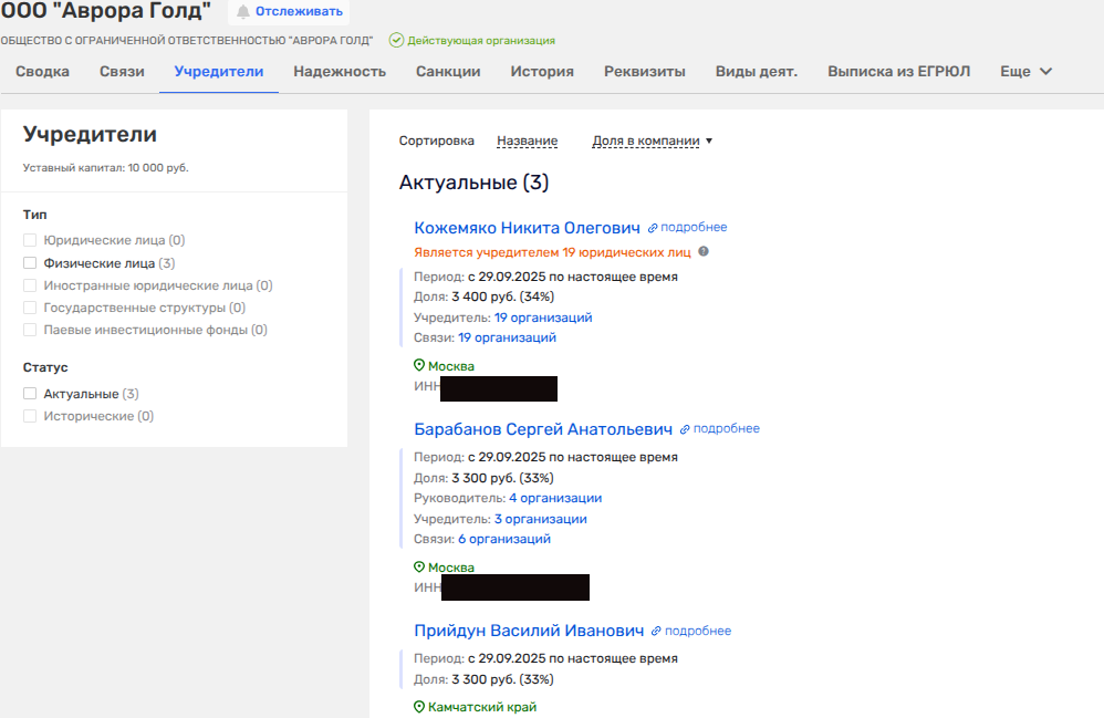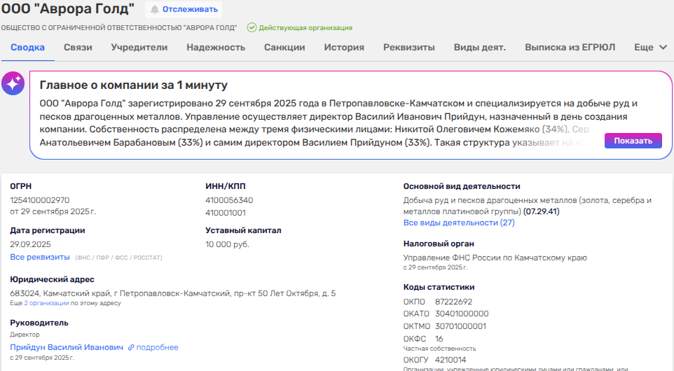 29 сентября 2025 года в Петропавловске-Камчатском было учреждено ООО «Аврора Голд», которое, судя по ОКВЭД, планирует заниматься добычей золота, серебра и металлов платиновой группы.