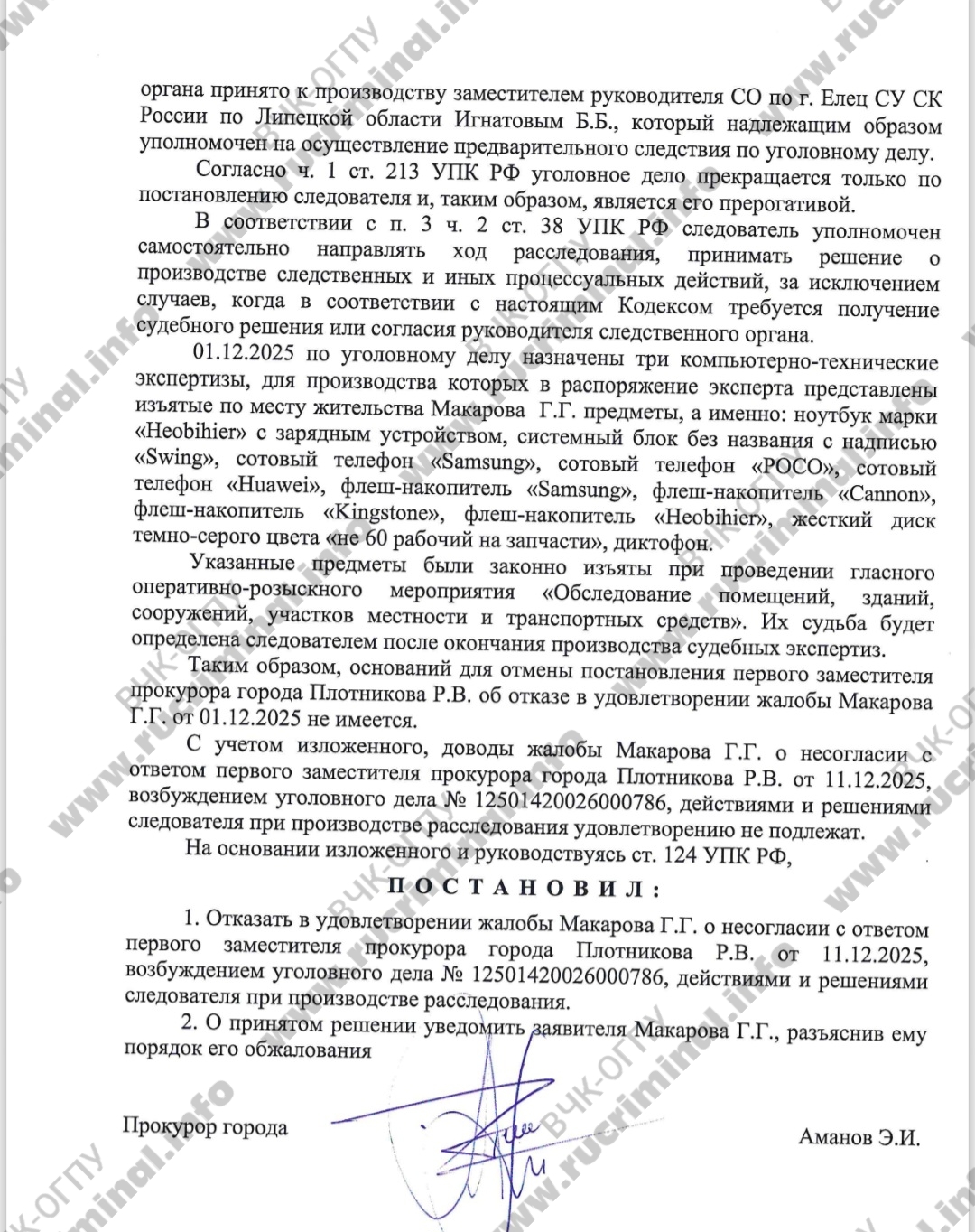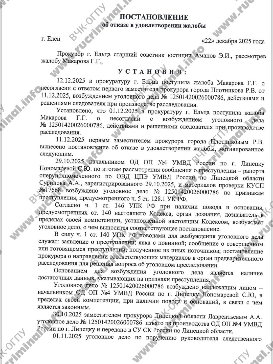 Сына пенсионерки Геннадия Макарова принудительно увезли в УВД Липецкой области, где продержали … сутки (никак не оформляя эти «мероприятия») . В результате с Макарова взяли письменные объяснения. Как оказалось, на тот момент вообще никакого уголовного дела не было.