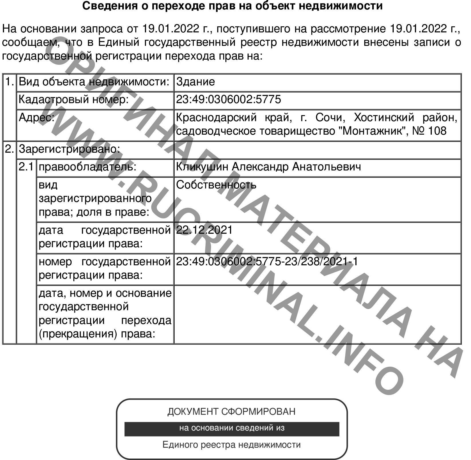 Расследование дела о незаконном присвоении земель краснодарского края организованной группой лиц вышло на новый уровень. Недавний материал Rucriminal.info про судью Верховного суда РФ Александра Кликушина (неожиданно ушел в отставку в июне 2021 года). У многих его отставка вызвала удивление- карьера Кликушина была «на подъёме», стал председателем судебного состава в гражданской коллегии. И тут покинул ВС. Как выяснили телеграм-канал ВЧК-ОГПУ, в реальности отставке Кликушина предшествовала скандальная ситуация, в реальности ему именно повезло, что ей не дали ход и разрешили просто уйти из ВС. Кликушин, как и ряд служителей Фемиды из нижестоящих инстанций, приняли крайне сомнительные решения относительно большого «куска» земли и рекреационных объектов в Сочи. А Кликушин стал обладателем…участка на этом самом «большом куске».