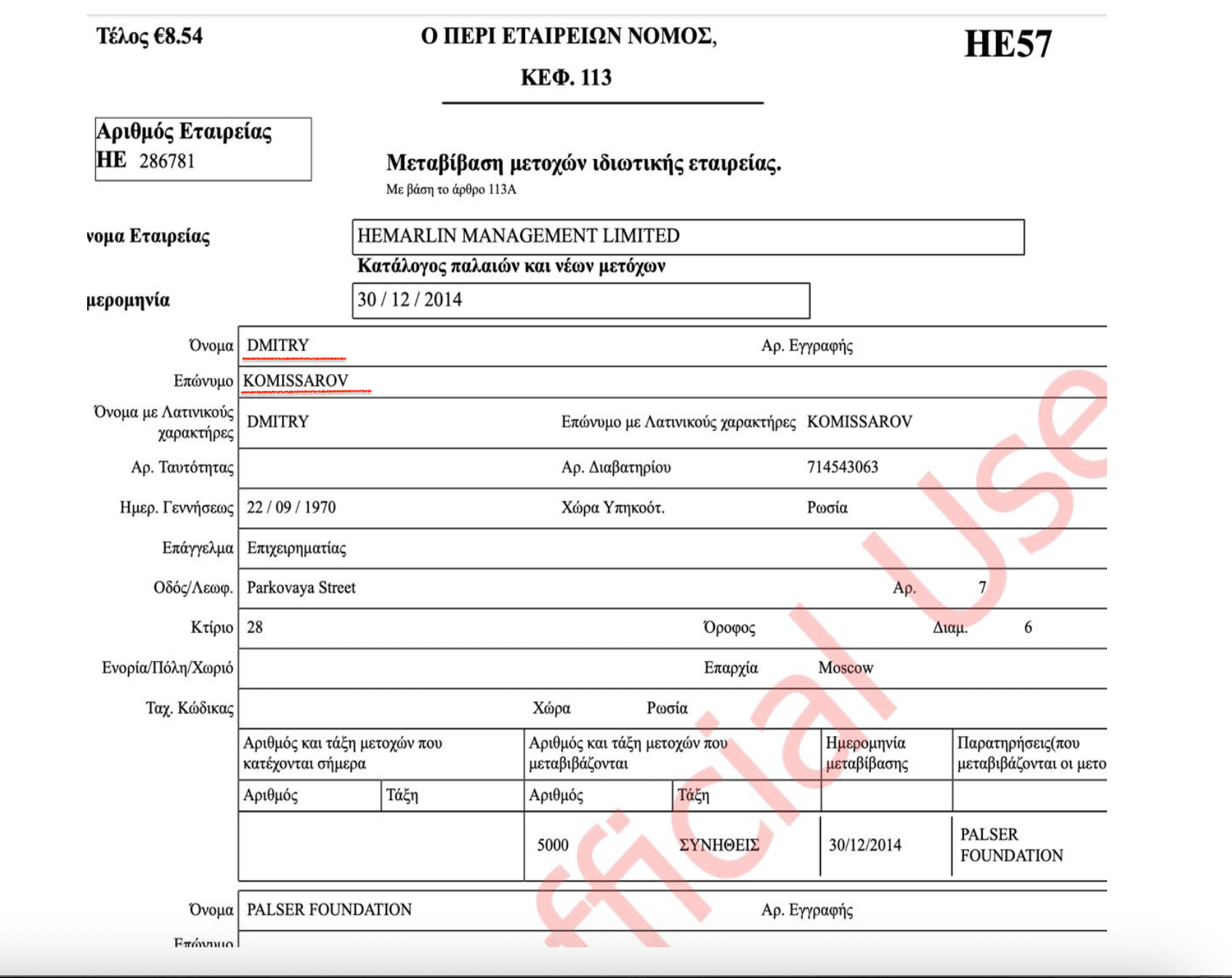 С 2011 года юридическое сопровождение Hemarlin осуществляла кипрская фирма Christodoulos G. Vassiliades & Co LLC. (i) Она оформляла ключевые сделки компании, в том числе передачу контроля от структуры Дмитрия Комиссарова лихтенштейнскому фонду Palser в 2014 году.