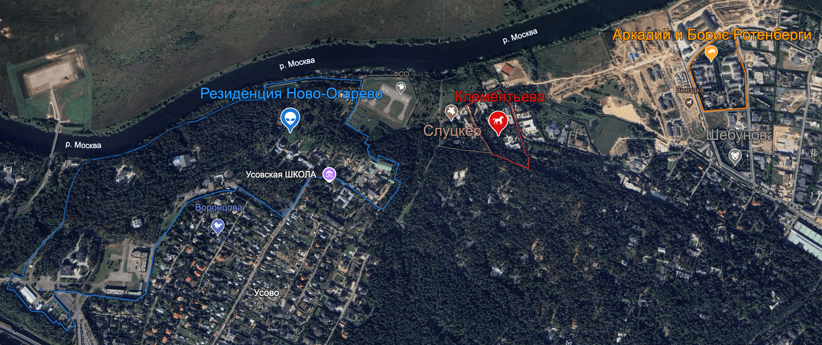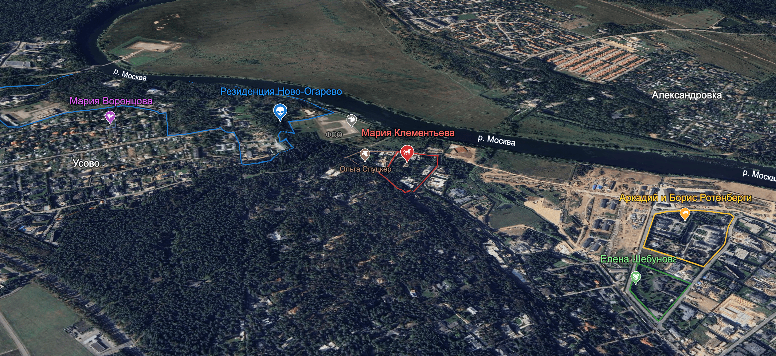 Соседние земельные участки в дачном поселке Ильинское (деревня Жуковка): собственники Ольга Слуцкер, Аркадий Ротенберг, Борис Ротенберг и Елена Шебунова (по данным кадастрового реестра).