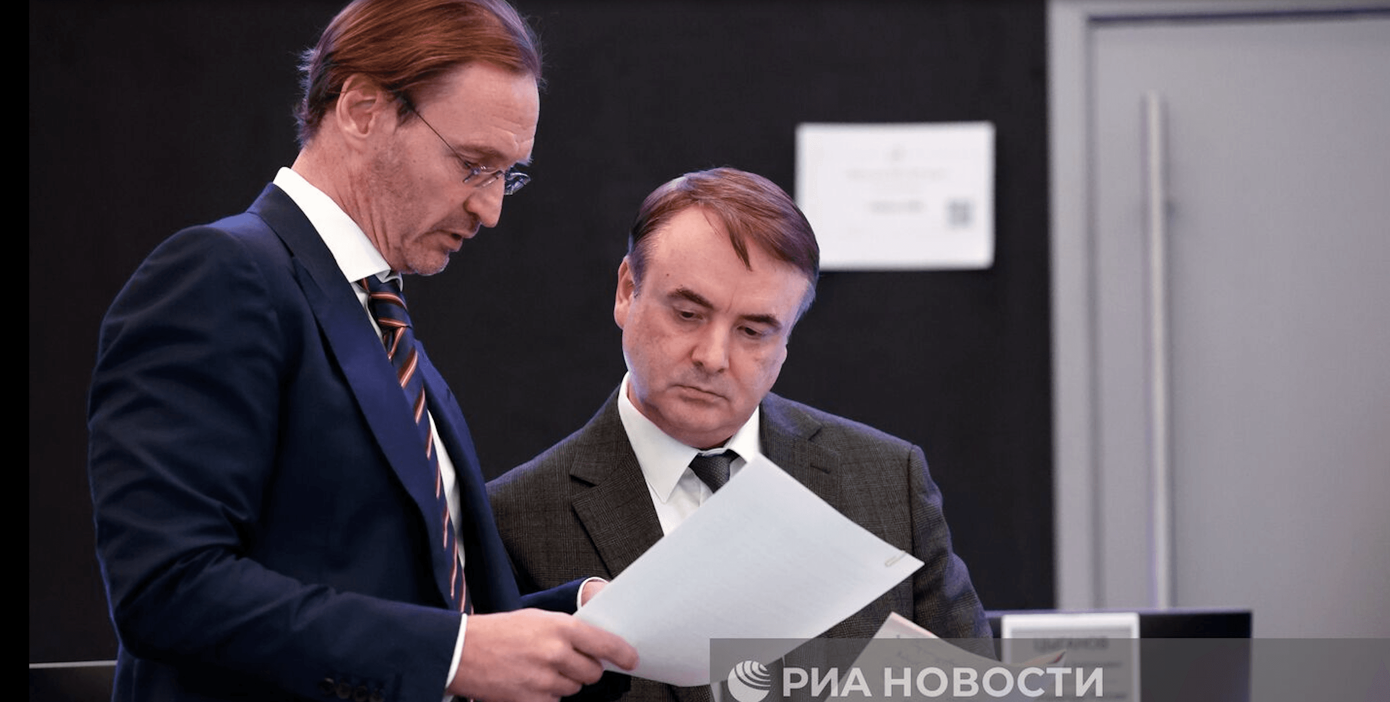 Председатель правления «Трансмашхолдинга» Дмитрий Комиссаров (слева) и первый замглавы Минприроды России Константин Цыганов на стратегическом совещании по импортозамещению промышленного ПО в Координационном центре правительства. Сентябрь 2022 года.