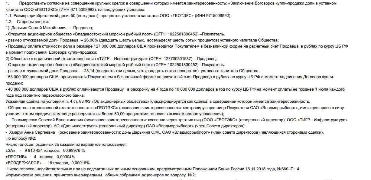 Кстати, несмотря на принятое решение о выкупе дарькинских долей, в ООО «ГЕОТЭКС» собственники не сменились и по сей день. Возможно, причина в том, что в арбитраже Приморья на сегодня слушается иск миноритария порта - некоего Владимира Турундаева. Он как раз таки оспаривает решения совета директоров, где были приняты выкупные решения. Заседание назначено на 5 февраля.