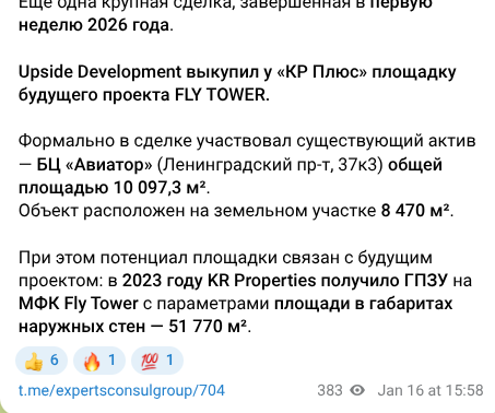 16 января стало известно, что девелопер Upside Development выкупил у компании «КР Плюс» отельера Александра Клячина площадку будущего офисного центра FLY TOWER. Сейчас на Ленинградский пр-т, 37, корп. 3 расположен бизнес-центр «Авиатор». Последний пустят под снос, а на его месте предполагается МФК Fly Tower, на который клячинский дивизион получил ГПЗУ еще в 2023 году.