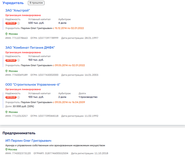 Также Нестеренко - бывший партнер Перлина по ликвидированным ЗАО «Комбинат Питания ДМФК» и ЗАО «Альтстрой».