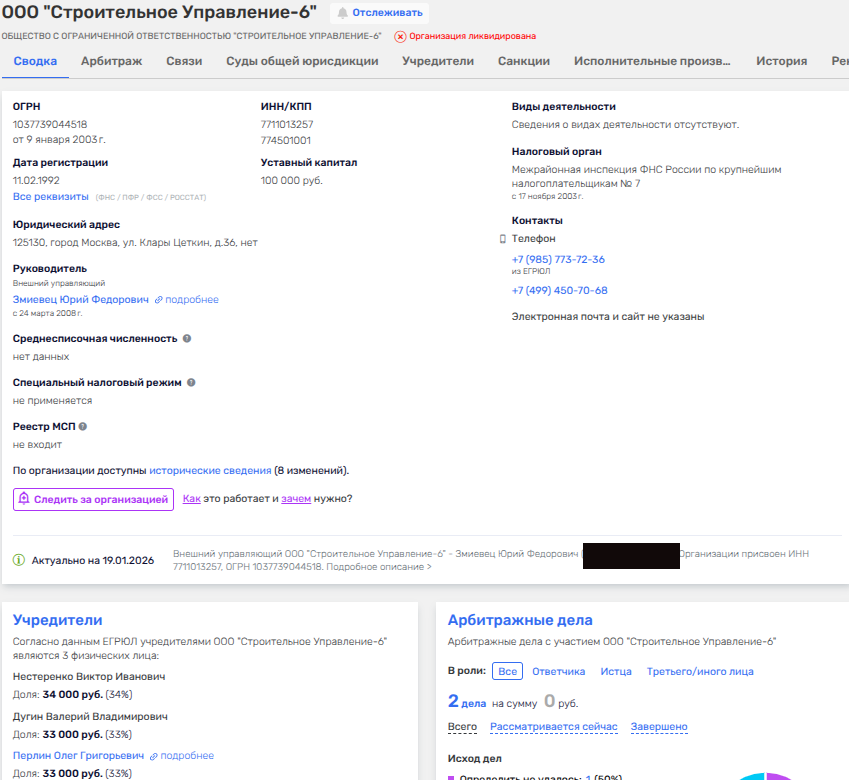 Фирмой по сей день руководит и частично владеет бизнес-партнёр Перлина Виктор Нестеренко. Их связывало ныне ликвидированное ООО «Строительное Управление-6».