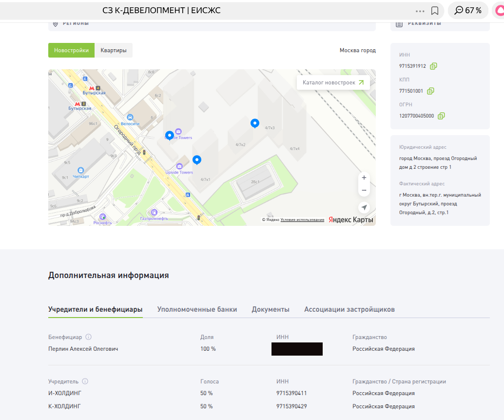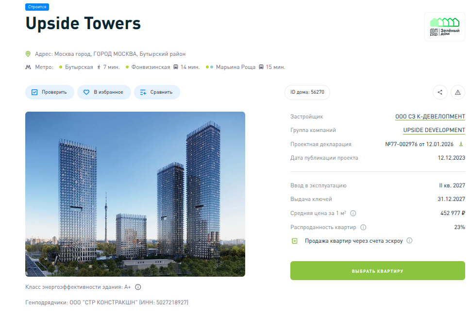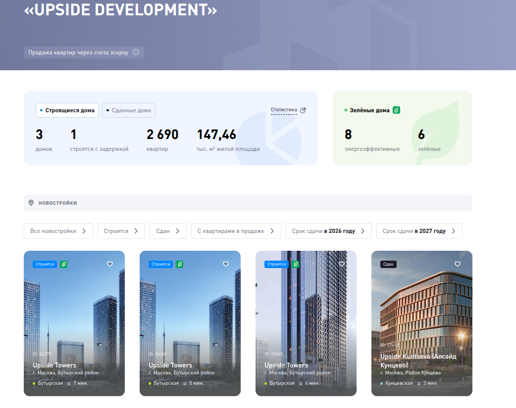 По данным единой информсистемы жилстроительства, ГК UPSIDE DEVELOPMENT строит на сегодня три дома, один из которых с задержками. Речь идет о ЖК бизнес-класса Upside Towers в Москве с распроданностью корпусов порядка 60%.