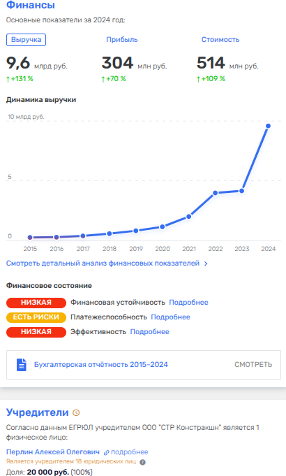 Но вот же какая занятная математика: генподрядчиком проекта выступает ООО «СТР Констракшн», которое принадлежит тому же Перлину. И этот генподрядчик демонстрирует совершенно другие показатели: выручка 2024 года - 9,6 млрд рублей и чистая прибыль - 304 млн рублей. У этого же ООО «СТР Констракшн» доля в дочернем строительном ООО «СД», которое перекидывали из рук в руки прочих фирм Перлина. Видимо, путая следы денег.