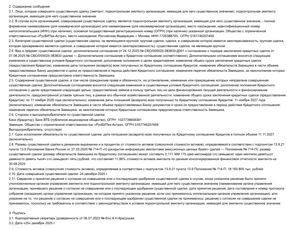 Новое сообщение - не более чем искусственная попытка ещё раз симулировать этот рост и поднять миллиард-другой на скачке. А деньги Фролову ой, как нужны: ведь одно из основных юрлиц дивизиона - ООО «РусБИТех-Астра» - должно ВТБ Банку свыше 2,1 млрд рублей, что составляет 11,96% стоимости активов эмитента по данным консолидированной финансовой отчетности. И пролонгировать сроки выплат до бесконечности банк не будет. Выплата в конце декабря 2025 года была сдвинута на 11 ноября 2027 года.