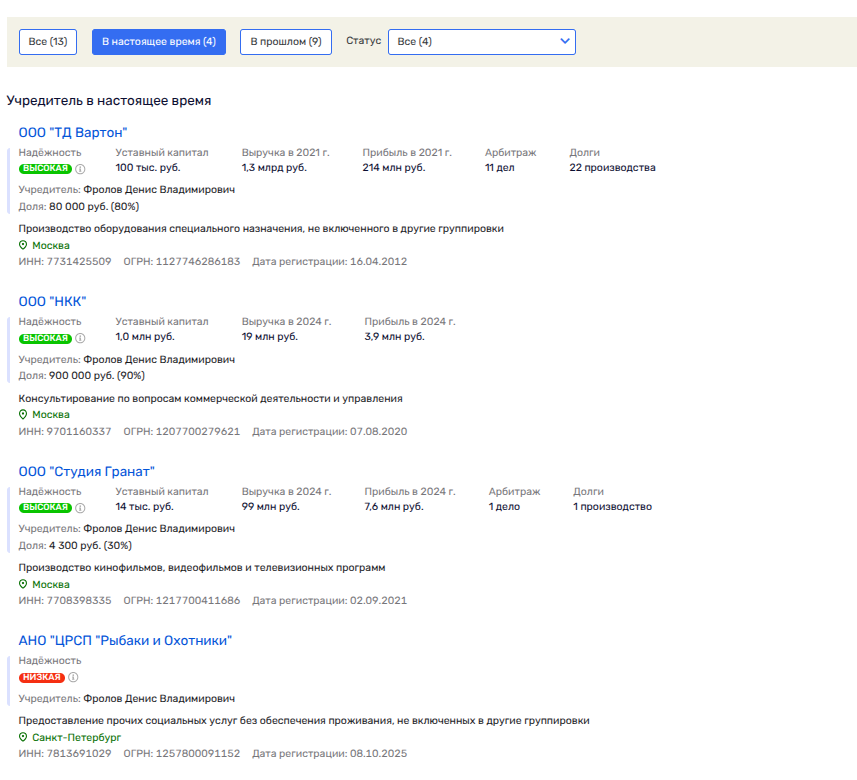 На сегодня бизнес Фролова - это группа Вартон по производству электрических ламп и осветительного оборудования и ГК «Астра», но большинство юрлиц в 2024-2025 годы стали скрывать своих владельцев, а также руководителей. Дивизион не просто ушел в тень, он создал мутное болото, скрыв всё, что можно и нельзя.