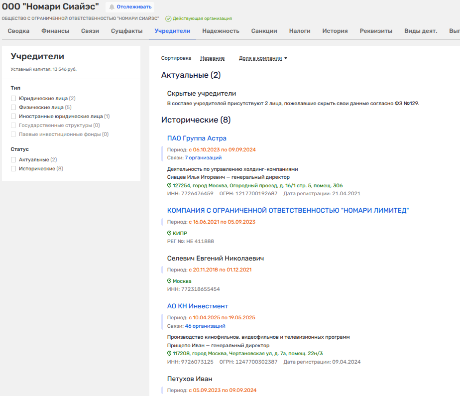 В 2024 году дочерние активы ПАО ГК «Астра» вдруг перестают отображать владельцев. В числе таковых оказывается и ООО «Номари Сиайэс», в чьем анамнезе оказался не только актив Фролова, но и некая кипрская кубышка - KNOMARY LIMITED.
