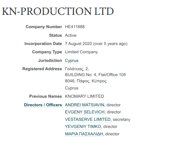 И что интересно: фирма на сегодня хоть и переименована в KN-PRODUCTION LTD, но вполне себе живая и директорами там люди с русскими фамилиями. При этом, например, один из них - некий EVGENY SELEVICH уже после начала СВО, возглавил на Кипре свежесозданное в июне 2023 года LERENARD LIMITED.