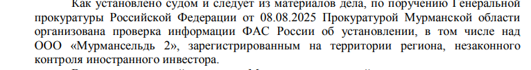 Из материалов судов, мы узнаем, что на основании данных ФАС Генпрокуратура еще в августе 2025 года поручила своим мурманским коллегам проверить сведения о незаконном контроле со стороны иностранного инвестора. И, похоже, подтверждение нашлось.