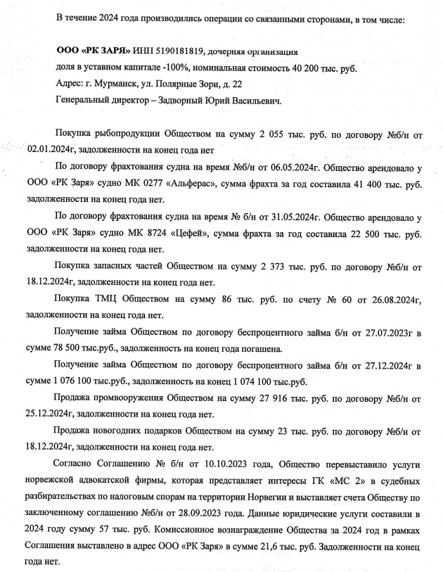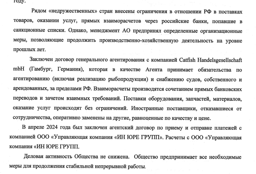 А между тем, когда мы открываем отчетность АО «Мурмансельдь 2» за 2024 год, то там черным по белому написано, что, во-первых, бенефициар - Юрий Задворный, а, во-вторых, еще некоторое время назад, чтобы обходить санкции, с немецкой фирмой Catfish заключен договор генерального агентирования. Указывалось, что именно это иностранное юрлицо будет снабжать суда и продавать рыбопродукцию за пределами России.