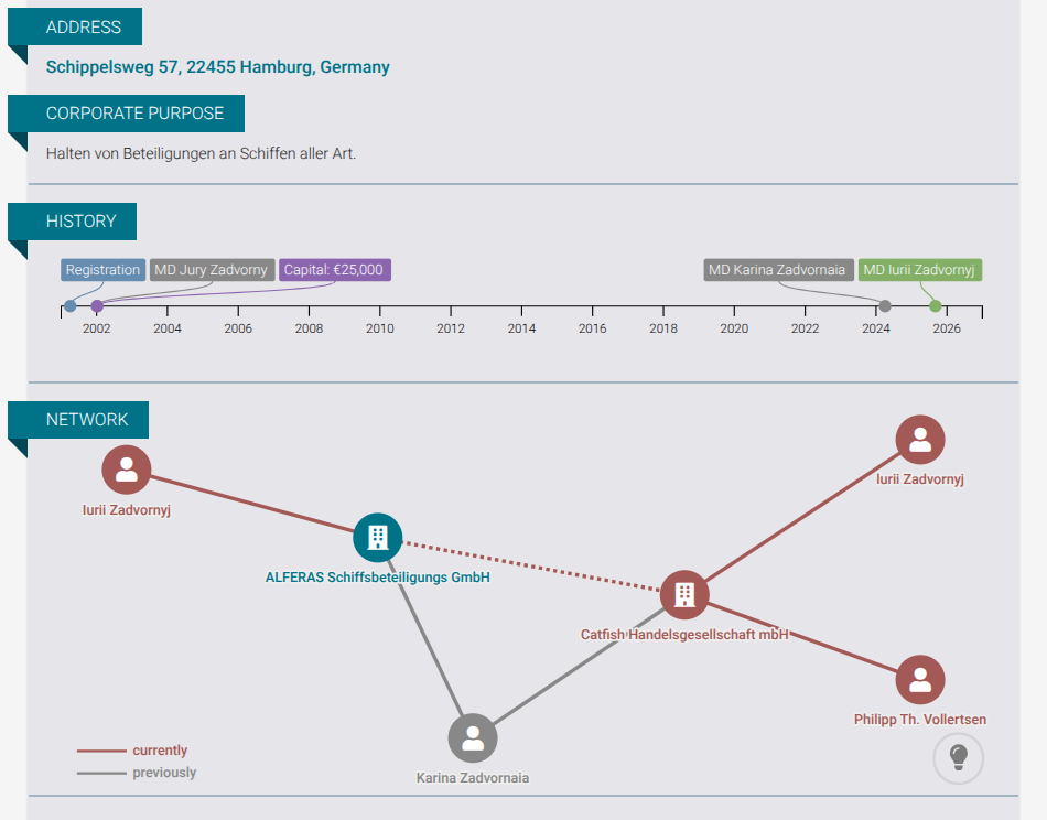 Так, на сайте ФАС была размещена схема контроля АО «Мурмансельдь 2», где в качестве фундамента фигурировали сразу две фирмы из Гамбурга - Catfish Handelsgesellschaft GmbH и ALFERAS Schiffsbeteiligungs GmbH. Оное, по данным ФАС, контролировало не только «Мурмансельдь 2», но и связанные ООО Компания «Андромеда» и «Рыболовецкий колхоз Заря» (ООО «РК Заря»).