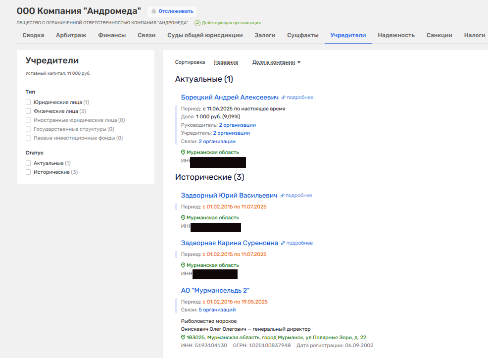 А ООО Компания «Андромеда», на которое оформлена часть рыболовецкого флота, и вовсе сливают некоему Андрею Борецкому. Но, что интересно, на Борецком числится лишь 9% доли, а остальная доля, контрольная, висит не распределенной с июля 2025 года. При этом «Андромеда» все также прописана с остальными активами Задворного.