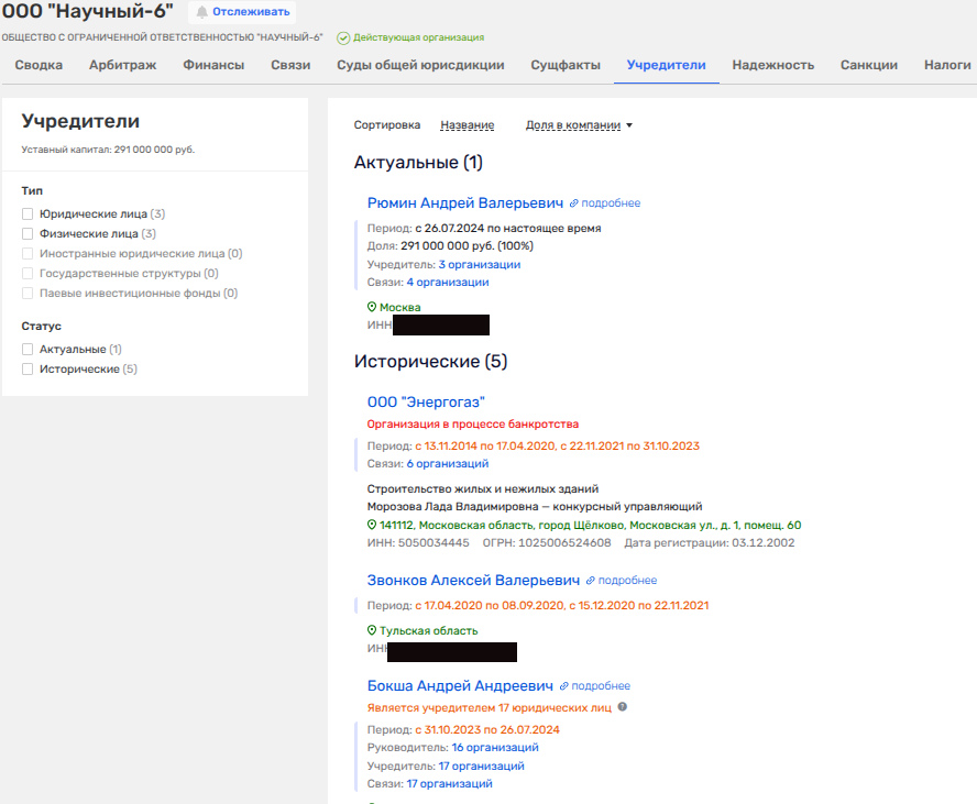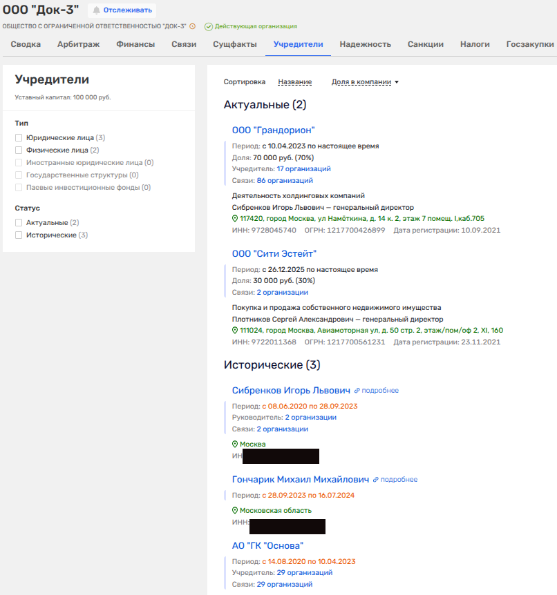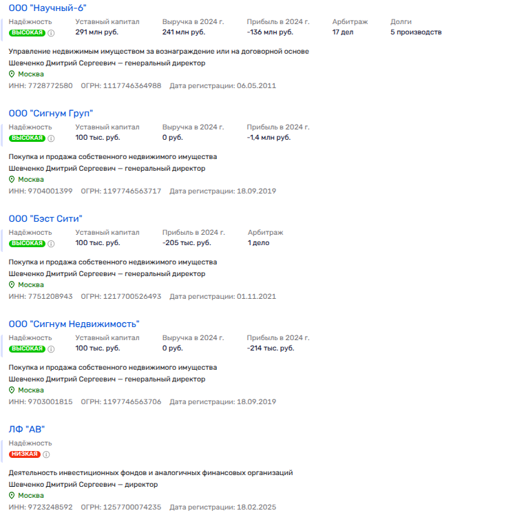 Потом в апреле 2025 года некое ООО «Останкино Сити» из ГК Основа становится ООО «Док-3», что, вероятно, и получило по цепочке земли бывшего деревообрабатывающего завода. И вот туда в качестве владельца 30% еще в конце декабря 2025 и ввели ООО «Сити Эстейт». Последнее по итогам 2024 года было убыточно на 23 млн рублей и в штате имеет 0 сотрудников. До 21 июля 2025 года ею владел Бокша лично, а на сегодня собственником числится созданное в мае 2025 года ООО «Сити Инвест», чьих владельцев также спрятали за ЗПИФ.