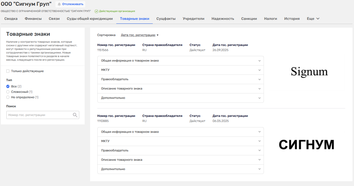 В свое время Бокша в две руки скупал земли в Подмосковье - более 250 га в разных локациях. И, судя по всему, скупал он их на деньги всё того же Рюмина. Ведь именно на последнего записано ООО «Сигнум Груп», на которое в мае и сентябре 2025 года оформили товарные знаки.
