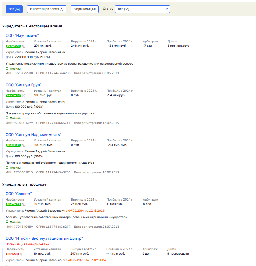 Он был владельцев 13 компаний, на балансе которых были активы на миллиарды рублей, один только бизнес-центр на Дубнинская, 83, проданный позднее за пару миллиардов, чего стоит. Сейчас Рюмин официально владеет тремя фирмами и все три напоминают прикрытие и технические однодневки.