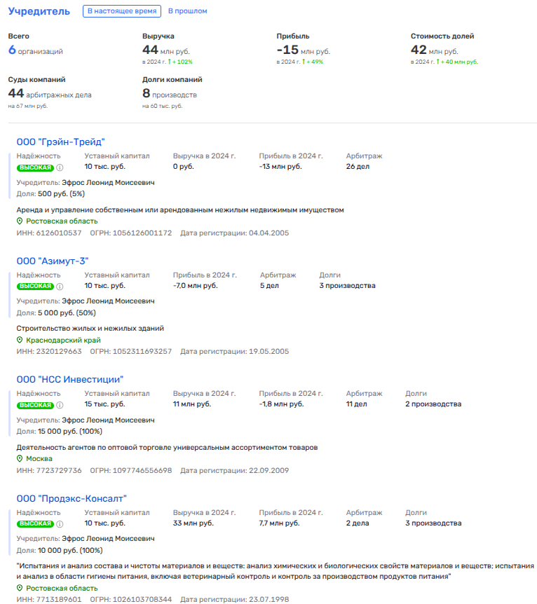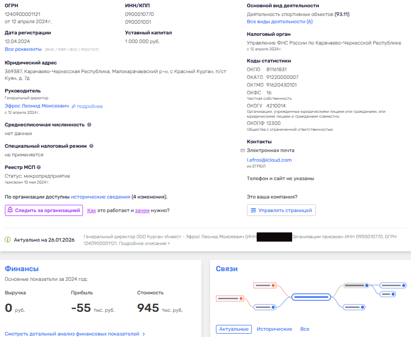 Итак, Леонид Эфрос, на которого и было оформлено ООО «Курган-Инвест», имеет бизнес в Ростовской области, на Кубани, в Москве, а теперь и в КЧР. Вот только за 2024 год все его фирмы принесли чистый убыток на 15 млн рублей. Но деньги в его случае не главное, а главное — связи.