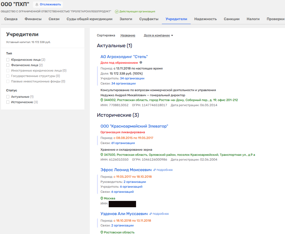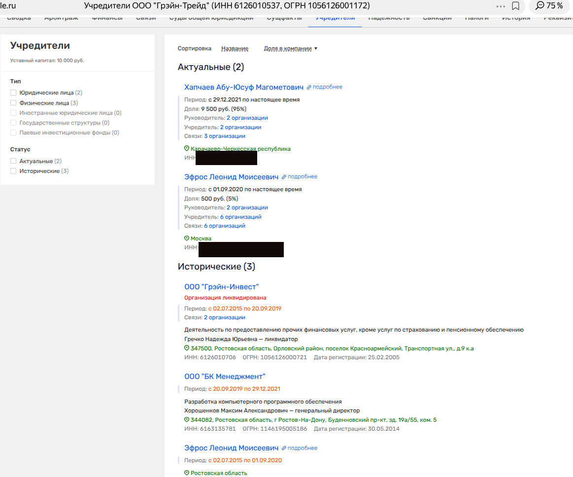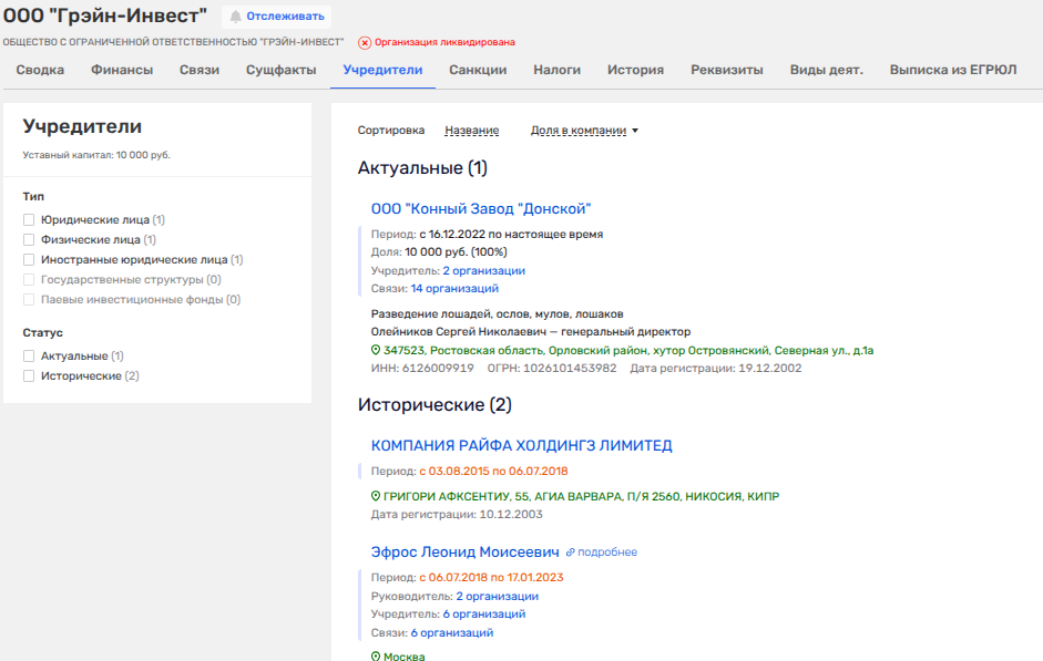 Так, в УК «Ростзернотранс» долю имело некое ныне ликвидированное ООО «Грэйн-Инвест». Среди владельцев последнего и отметился офшор, который потом передал актив все тому же Эфросу.