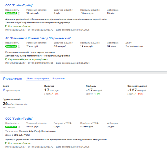 Также Хапчаев в 2023 году был совладельцем фирмы по разведению лошадей ООО «Эльбрус Агро-Инвест», что в 2024 году перешла к компании, связанной с Махмудовым. Хапчаев был связан с Махмудовым и через компанию «Аргамак». Как вам такое совпадение? Чуете, как откуда-то пахнуло коррупционной ноткой в этом скупочном букете?