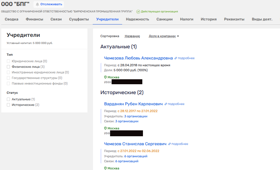 А владельцы у БПГ весьма и весьма интересные - с 2017 по январь 2022 года - Рубен Варданян, с 27 января по 2 июня 2022 года - сын генерала Сергея Чемезова Станислав, а после него еще один член семьи главы Ростеха - Чемезова Любовь Александровна. При этом, если Станислав Чемезов - владелец пачки фирм, помимо этой, и ведет совместный бизнес с семьей вице-премьера Мантурова, то мадам Чемезова контролирует лишь эту часть империи высокого семейства.