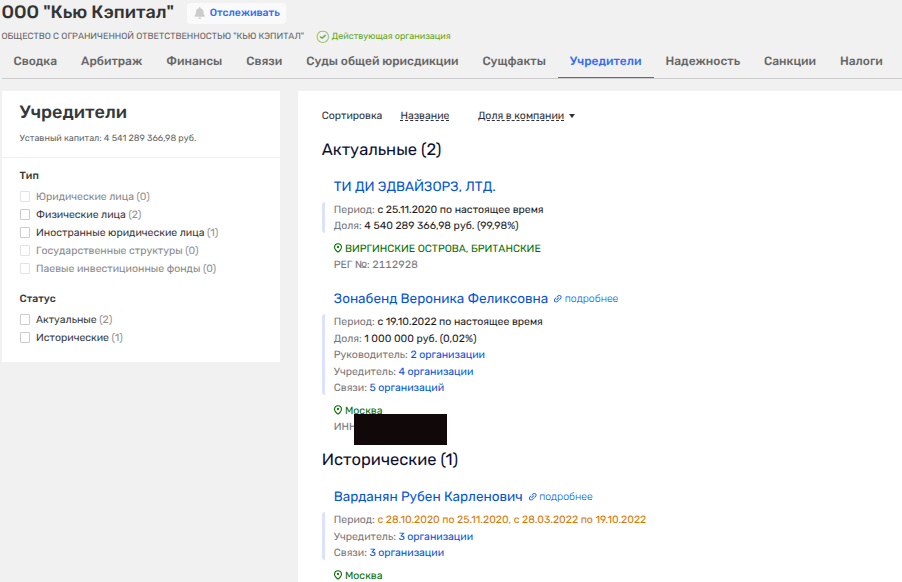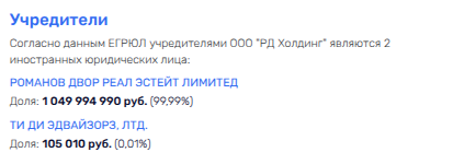 ООО «Кью Кэпитал» ранее владел армянский олигарх Варданян, а сейчас - его жена Вероника Зонабенд и матерый офшорище - ТИ ДИ ЭДВАЙЗОРЗ, ЛТД с Британских Виргинских островов. Более того, на офшоре с неизвестным бенефициаром числится и доля в ООО «РД Холдинг», где его партнером выступает другой офшор - РОМАНОВ ДВОР РЕАЛ ЭСТЕЙТ ЛИМИТЕД, также с BVI.