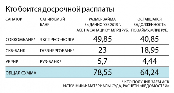 Санаторы в заявлениях указали, что из-за исключения из реестра требований их подопечных («Экспресс-Волги» и Вуз-банка) АСВ может потребовать досрочного возврата выделенных на их санацию займов, обратить взыскание на полученное обеспечение и даже отстранить их от участия в оздоровлении банков (копии жалоб есть у «Ведомостей»). В соответствии с генеральными соглашениями с АСВ и договорами займа, на которые ссылаются банки, агентство в 2015 г. выделило на санацию банков под 0,51% годовых на 10 лет Вуз-банку – 5,7 млрд руб. (в том числе под поручительство УБРиРа), Совкомбанку – 49,9 млрд (под залог прав требований по кредитам).