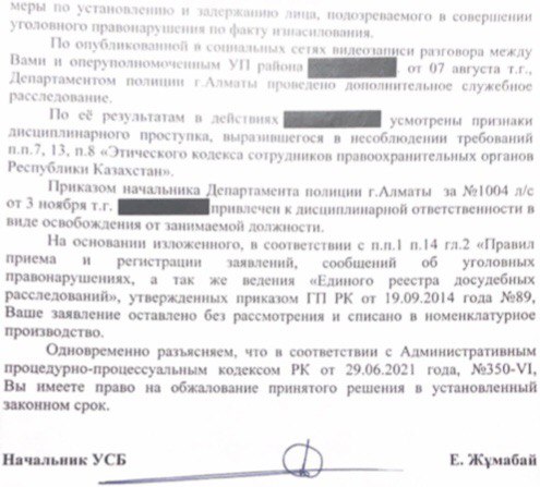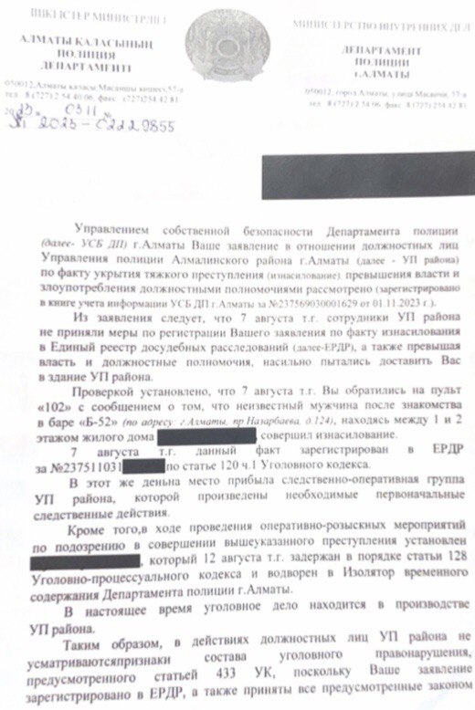 В официальном письме ДП Алматы указано, что заявление зарегистрировано по статье 120 УК РК – "Изнасилование". Уголовное дело находится в производстве районного Управления полиции. 12 августа предполагаемого насильника взяли под стражу и водворили в ИВС, но где он находится сейчас – не ясно. При этом жертва изнасилования уверяет, что обидчик на свободе.