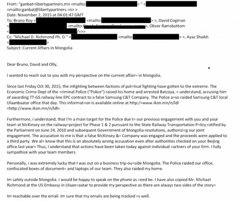 Справка: В 2013 году сообщалось, что компания Liberty Partners, управляющим директором которой был Чулуункхуу Ганбат, консультировала компании по инвестированию в промышленный парк, который планировалось построить в Монголии.