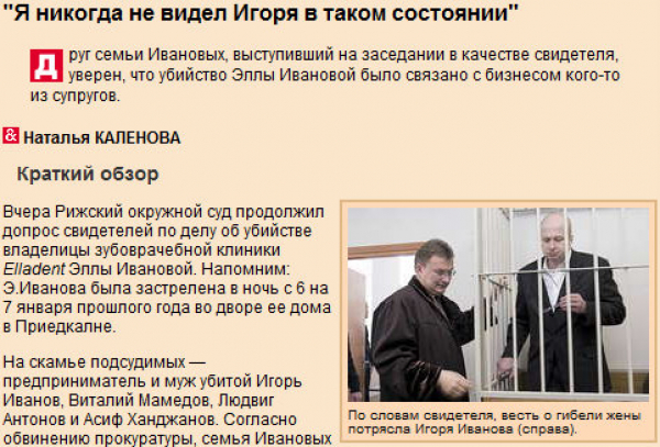Вчера Рижский окружной суд продолжил допрос свидетелей по делу об убийстве владелицы зубоврачебной клиники Elladent Эллы Ивановой. Напомним: Э.Иванова была застрелена в ночь с 6 на 7 января прошлого года во дворе её дома в Приедкалне.